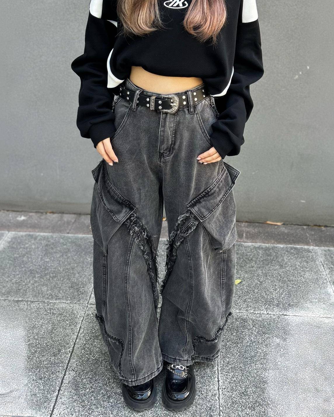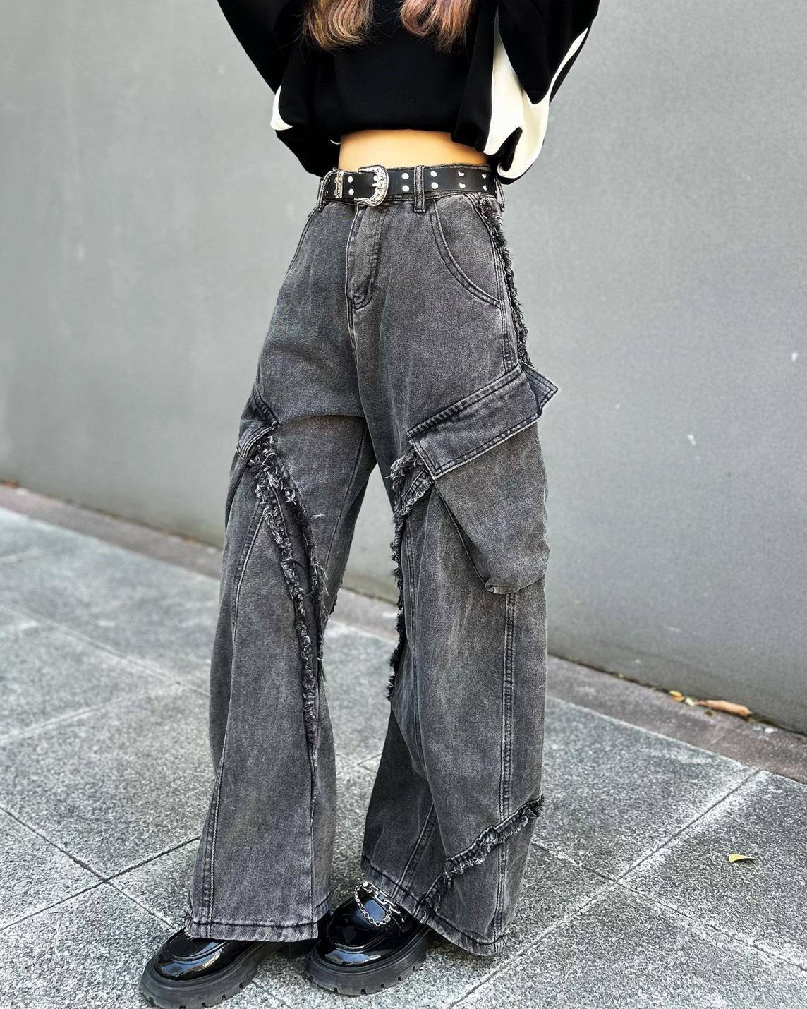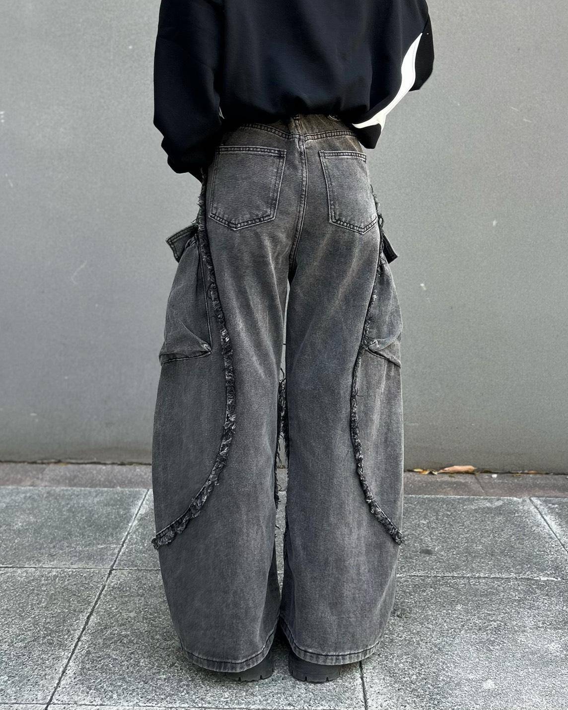 -立體不規則抽鬚線條+工裝大口袋拼接,增強褲子的份量感與層次感