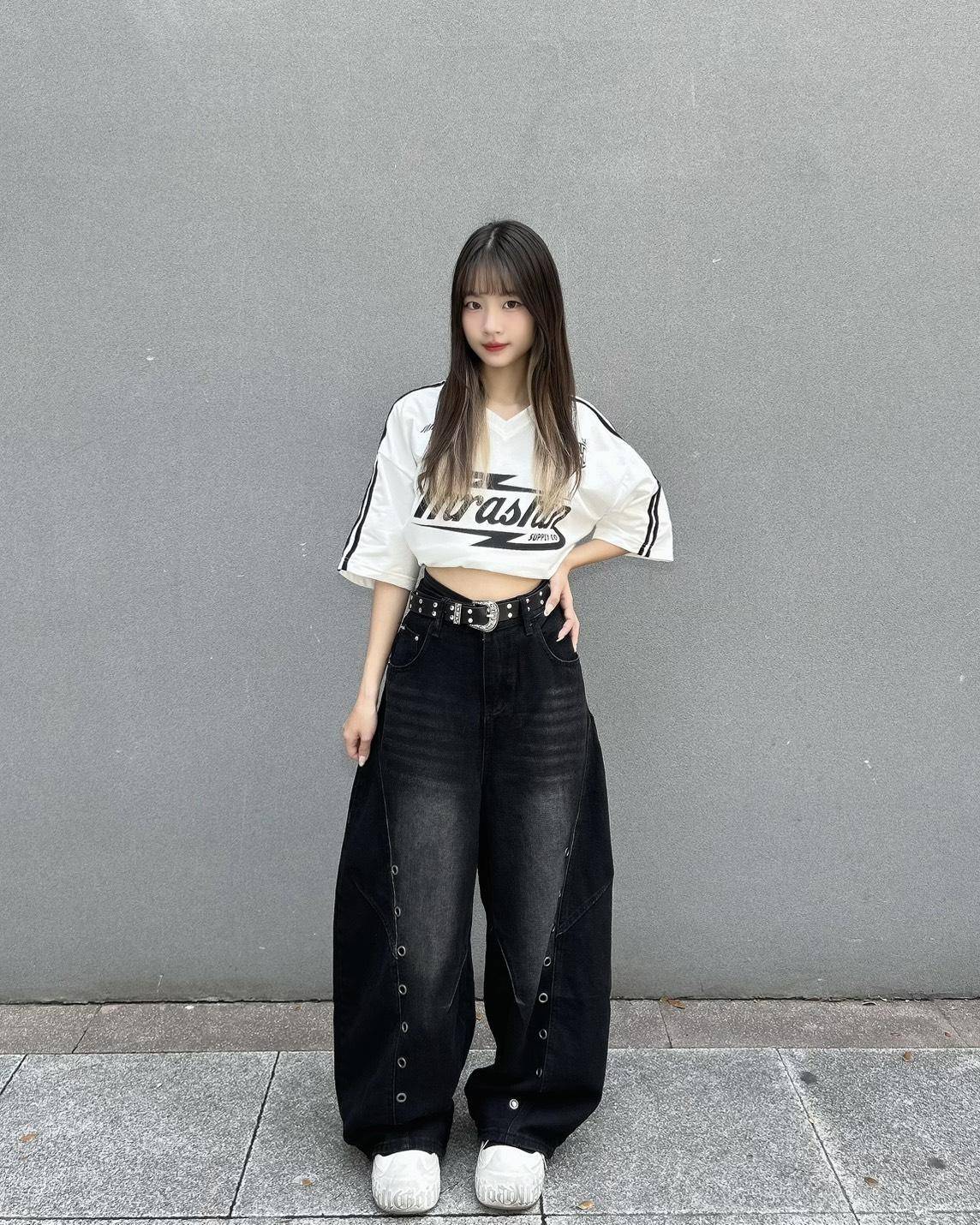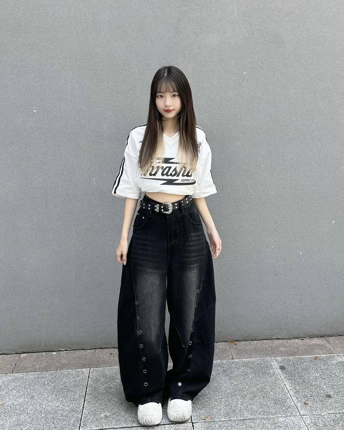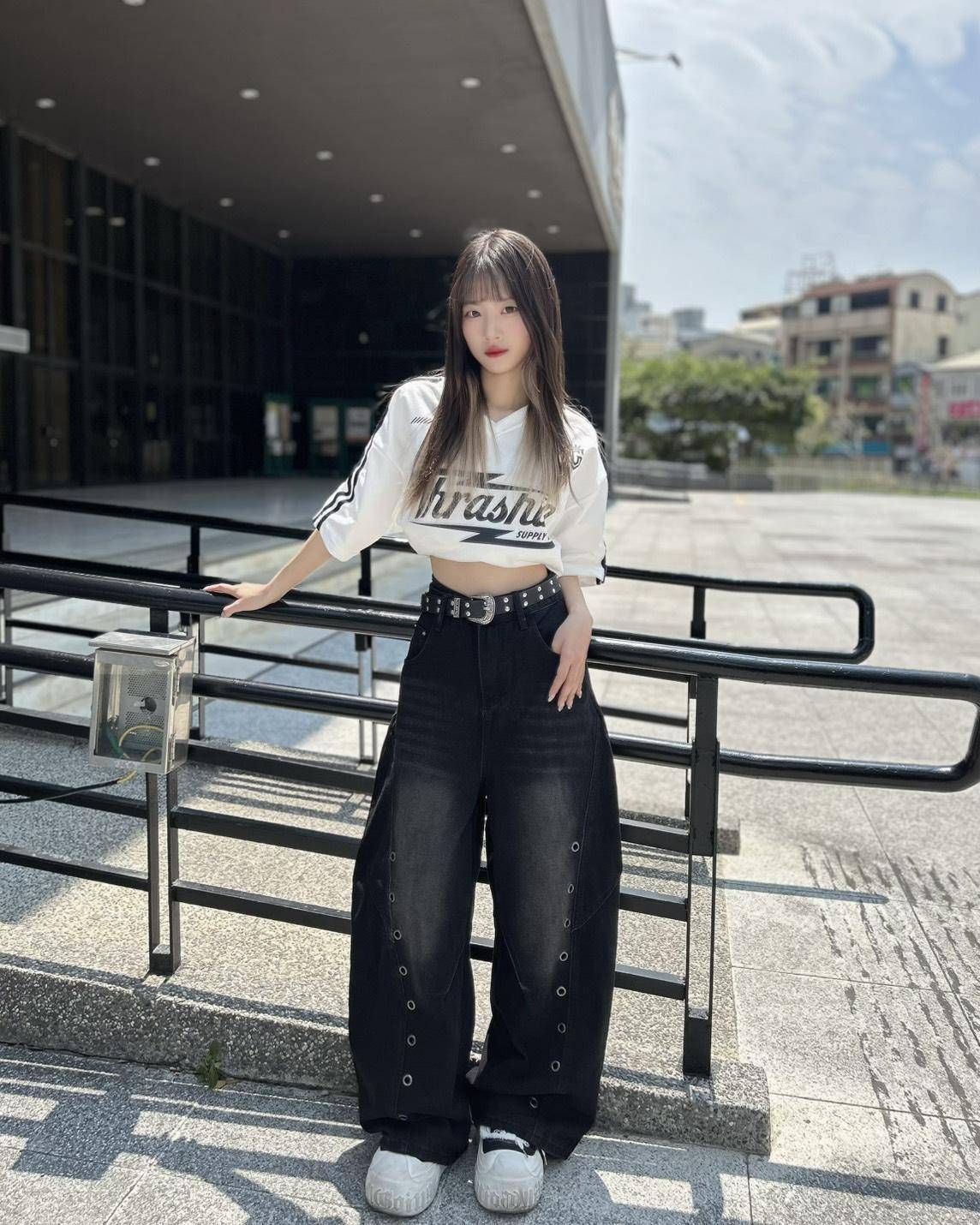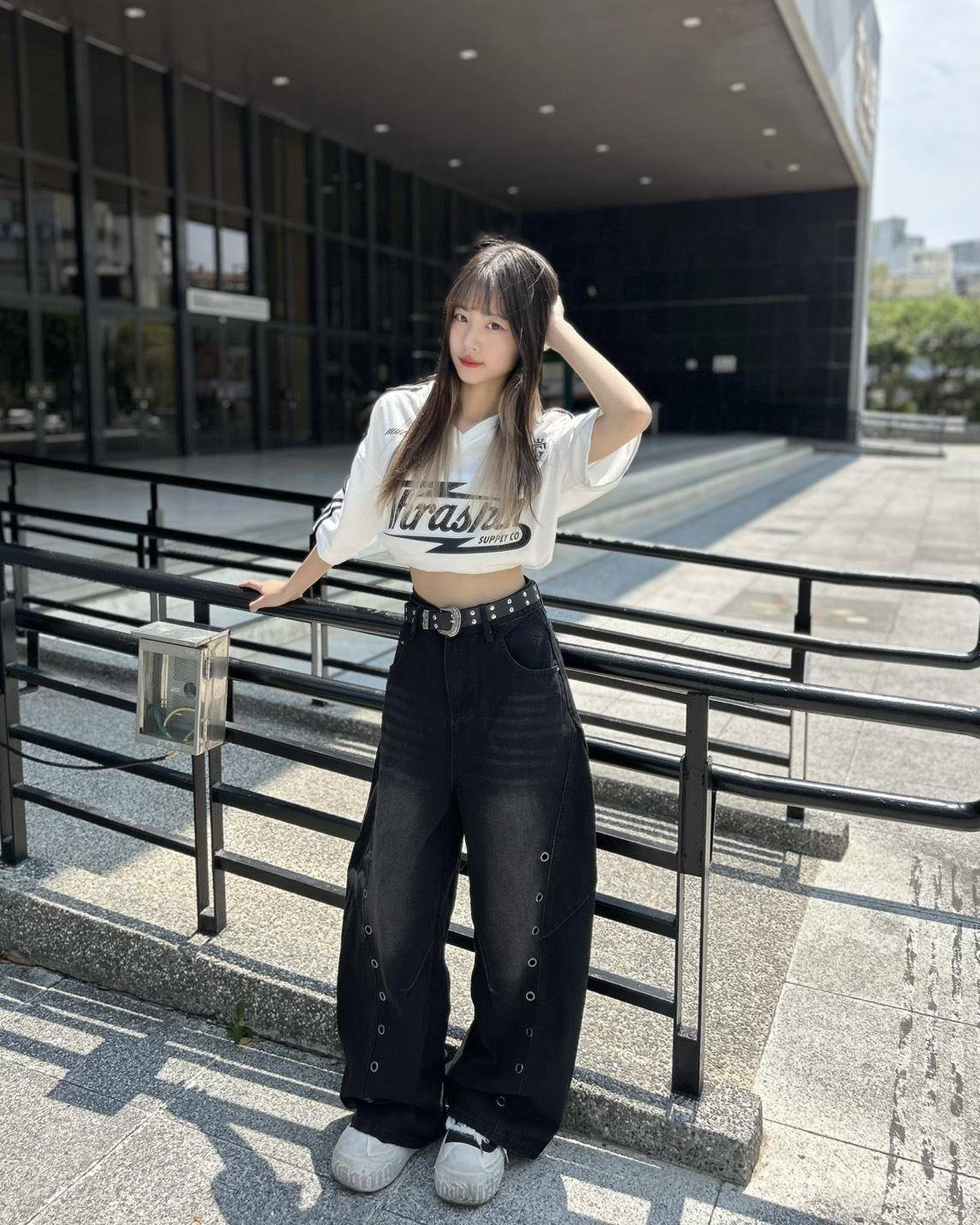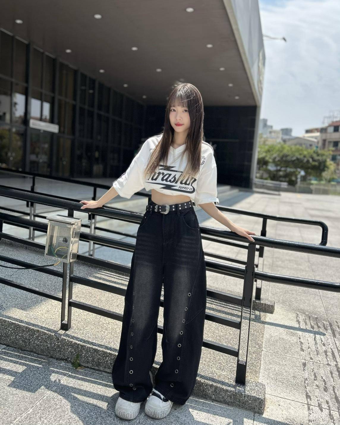 腰繫皮帶剛好,褲長落地感。